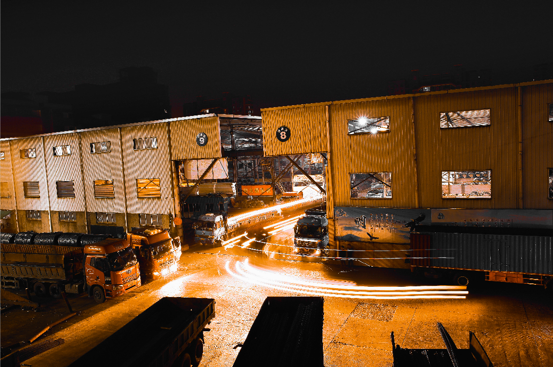 明海鑫專業(yè)鋼材交易市場(chǎng),裝貨發(fā)車車水馬龍景象。
